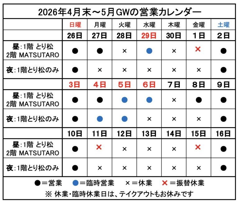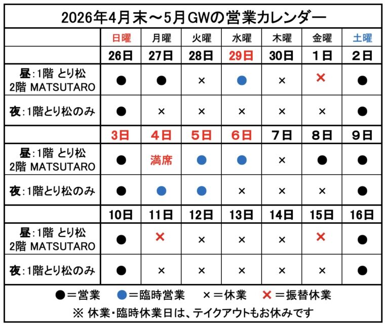 2024年3月より、1階とり松、2階MATSUTAROとも土曜・日曜は夜も営業しています。